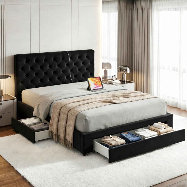 Built with three spacious wheeled storage drawers and a headboard-integrated charging station, it’s the perfect solution for keeping your bedroom clutter-free while ensuring your devices are always powered and within reach.